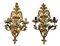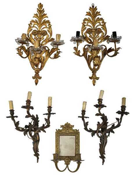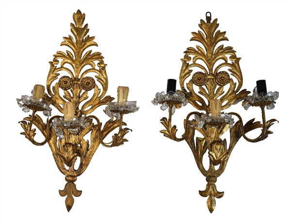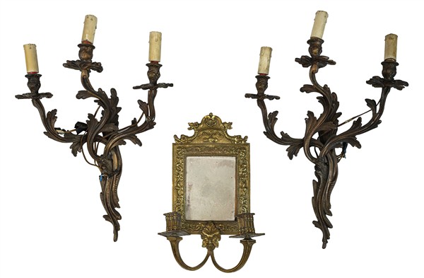 Lotto 1865 | Lotto composto da due coppie di applique a tre luci in metallo e metallo dorato