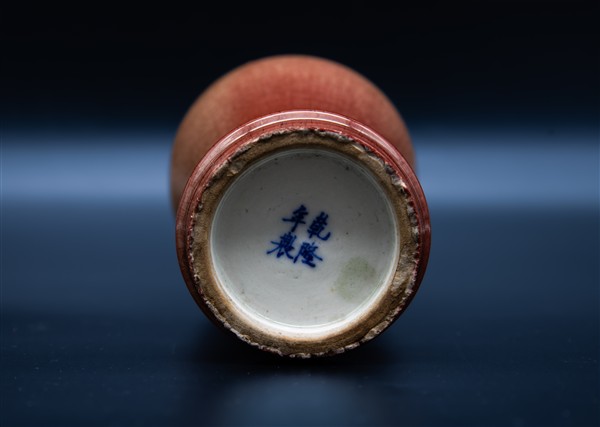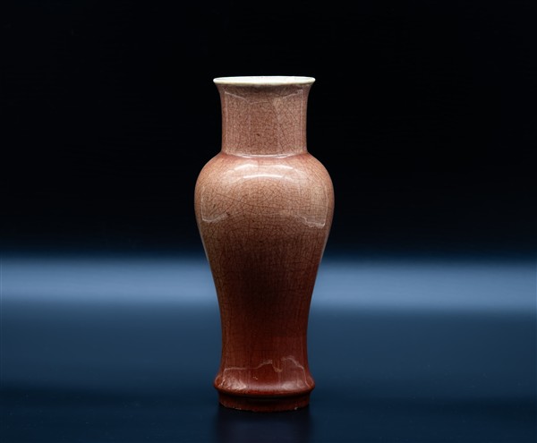 Vaso in ceramica craquele a fondo rosso. Marcato sotto la base. Cina, dinastia
