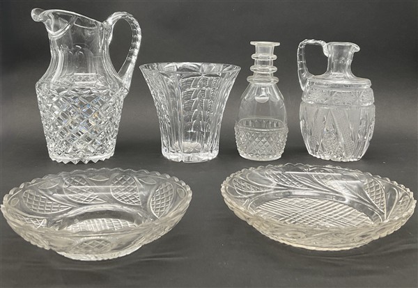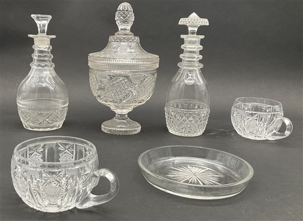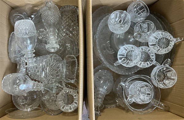 Due cartoni contenenti numerosi oggetti per la tavola in vetro e cristallo molato e inciso di diversa epoca e forma (difetti)