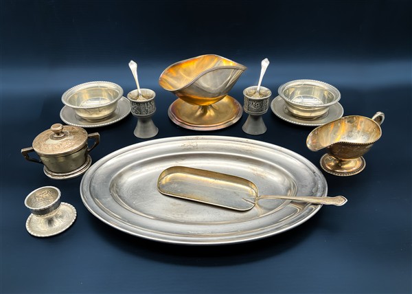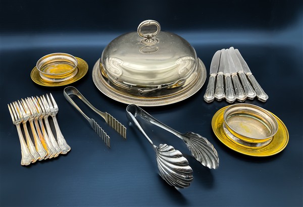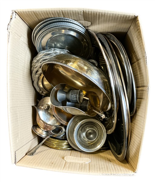Lotto 1874 | Cartone contenente numerosi oggetti per la tavola in metallo argentato e altri