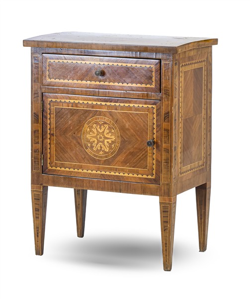 Comodino impiallacciato e intarsiato in legni vari con fronte ad un cassetto e
