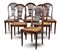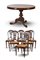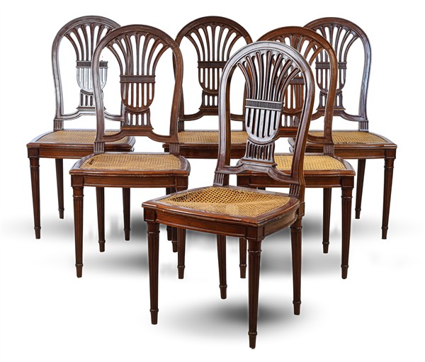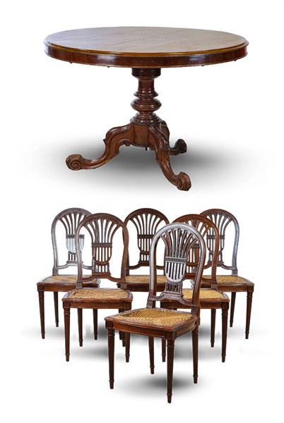 Lotto composto da tavolo in mogano massello e lastronato con piano circolare a vela, fusto tornito su base tripode terminante a ricciolo (h cm 81, d cm 120) e sei sedie con schienale a giorno, sedute impagliate e gambe scanalate (difetti)