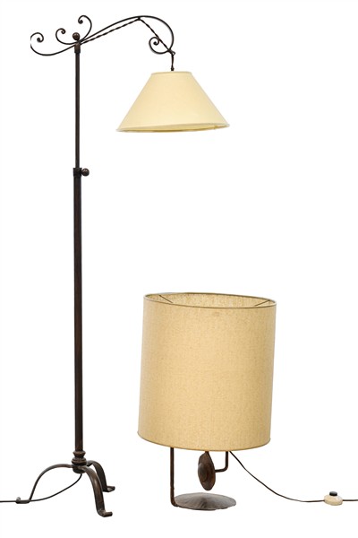 Lotto composto da una lampada da terra in ferro forgiato con altezza regolabile ad una luce, ed una lampada da appoggio con sostegno in ferro battuto e patinato. Con paralumi (h cm 157 e h cm 96) (difetti)