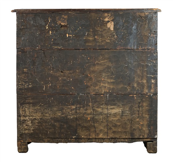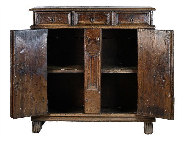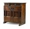 Credenza in castagno a due sportelli riquadrati e tre cassetti sottopiano, piedi scanalati. Abruzzo, secolo XVII (cm 113x110x58) (difetti)