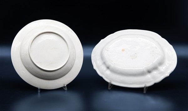 Manifattura di Pasquale Rubati, Milano, secolo XVIII. Lotto in maiolica composto da un piatto dipinto in policromia a fiori e dorature ed un vassoietto a profilo mistilineo con decoro al carabiniere con pagoda (L max cm 27) (difetti)