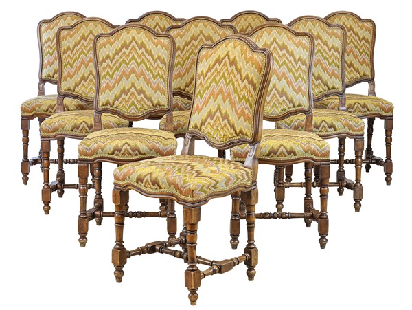Gruppo di dieci sedie di forma sagomata con gambe tornite riunite da traversa, seduta e schienale rivestite in tessuto fiammato policromo (difetti)