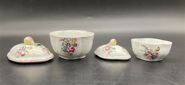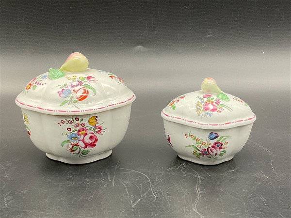 Manifattura Ginori, Doccia, secolo XVIII. Due zuccheriere con coperchio in porcellana dipinta in policromia a motivo floreale detto "al mazzetto", prese a frutto a tuttotondo (cm max 14x12x12) (difetti)