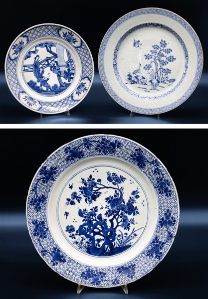 Lotto composto da tre piatti in porcellana dipinta in monocromia blu con decori diversi. Cina, dinastia Qing, secolo XVIII (d. Max cm 34) (difetti e sbeccature)