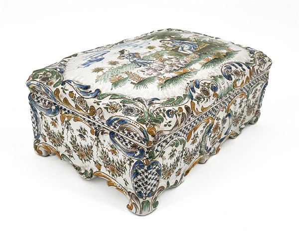 Manifattura francese, secolo XIX. Scatola con coperchio in maiolica dipinta in policromia a fiori e con Diana e Endimione sul coperchio, marcata sotto la base (cm 24x10x16) (difetti)