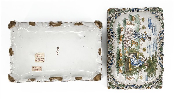 Manifattura francese, secolo XIX. Scatola con coperchio in maiolica dipinta in