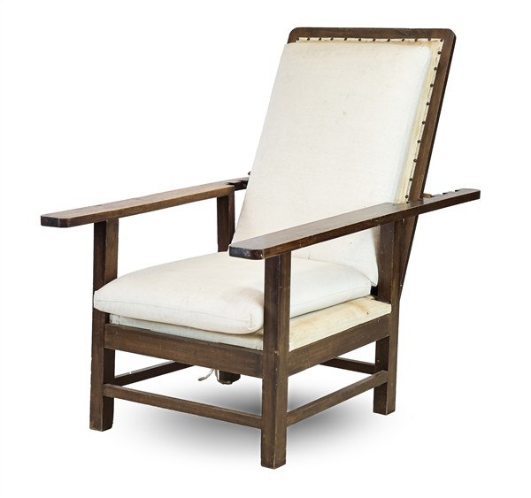 Poltrona da riposo in noce con schienale reclinabile e regolabile, gambe squadrate e sedute imbottite. Secolo XX (difetti)