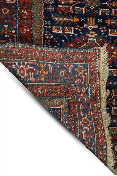 Tappeto passatoia Karadagh, confine Persia-Caucaso, secolo XX. Decoro con medaglioni romboidali su fondo blu notte cosparso di rami fioriti (cm 413x94) (difetti)