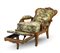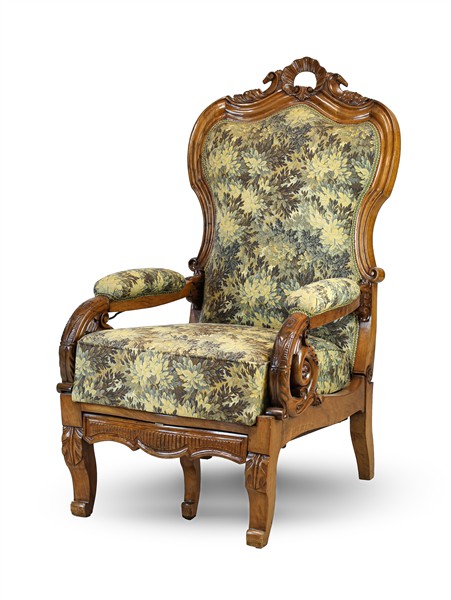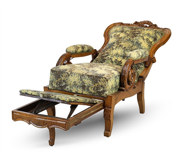 Poltrona reclinabile in noce intagliato con cimasa traforata a motivo rocaille, braccioli terminanti a ricciolo con voluta fogliacea, poggia gambe estraibile. Secolo XIX (difetti)