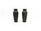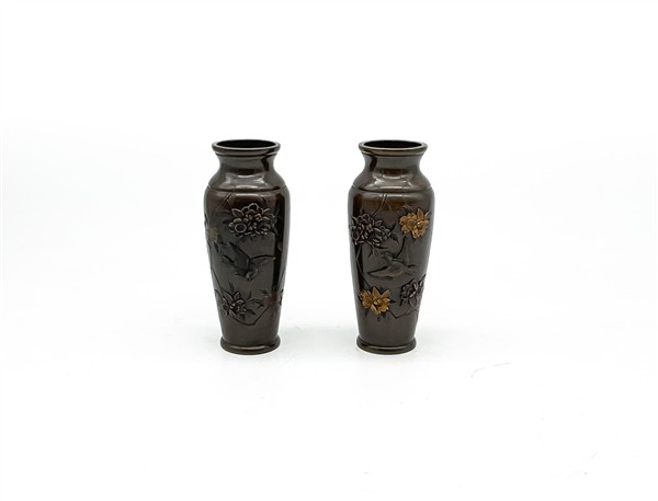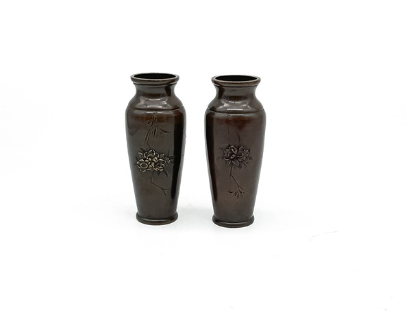Coppia di piccoli vasetti in bronzo inciso con decoro floreale e volatili. Giappone, periodo Meiji (1868-1912) (h. cm 15) (difetti)
