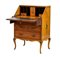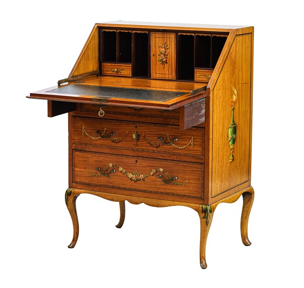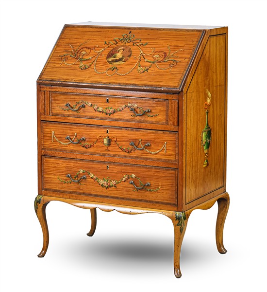 Ribaltina impiallacciata in satinwood e parzialmente dipinta in policromia a trofei, vasi, festoni fioriti e medaglione con figura entro ghirlande, fronte a tre cassetti e calatoia celante due tiretti, antina, vani a giorno e piano di scrittura con riserva in pelle. Inghilterra, secolo XIX (cm 69x99x46) (difetti)