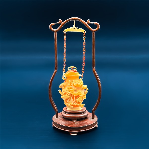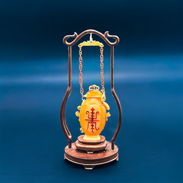 Vaso sospeso in pietra dura scolpita con coperchio su supporto in legno Cina,