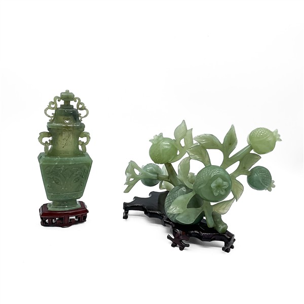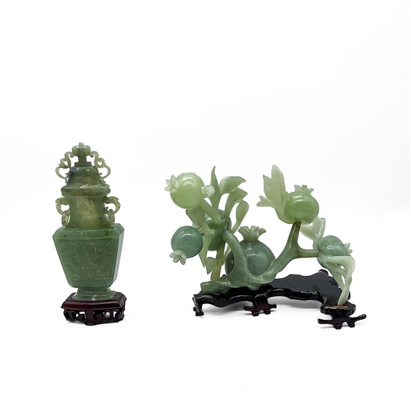 Lotto composto da un vaso biansato in giadeite con decoro Taotie con base in legno (h tot cm 23) e un gruppo in pietra dura a frutti su base in legno (l cm 22) con base in legno. Cina secolo XX (difetti e restauri)