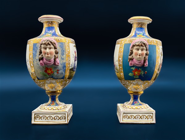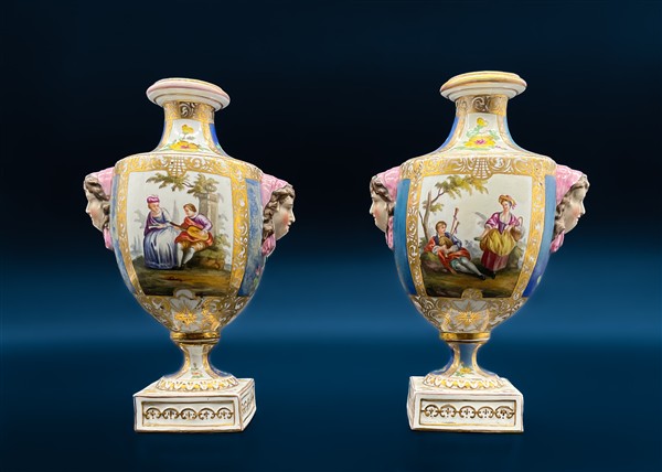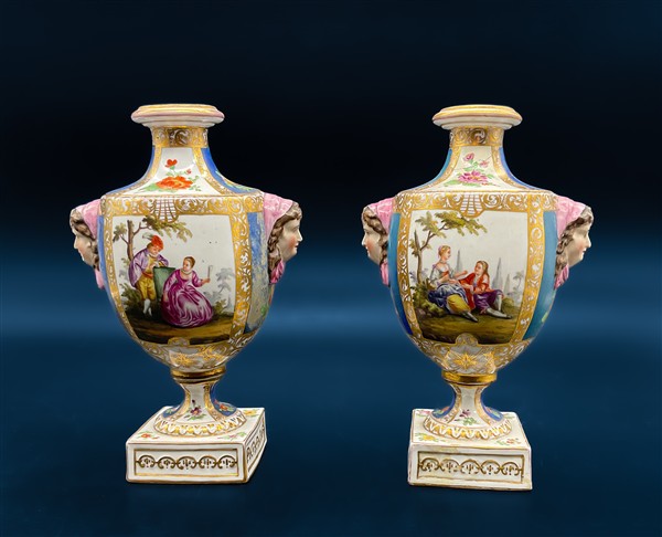 Manifattura del secolo XIX. Coppia di vasi in porcellana dipinta in policromia a scene galanti e fiori entro riserve con profili in oro, corpo a balaustro con anse a volti muliebri e base quadrata (h cm 22) (difetti e un vaso con restauro al collo)