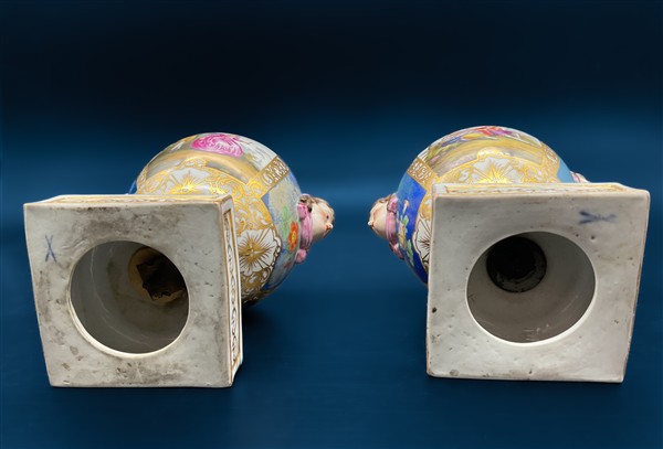 Manifattura del secolo XIX. Coppia di vasi in porcellana dipinta in policromia