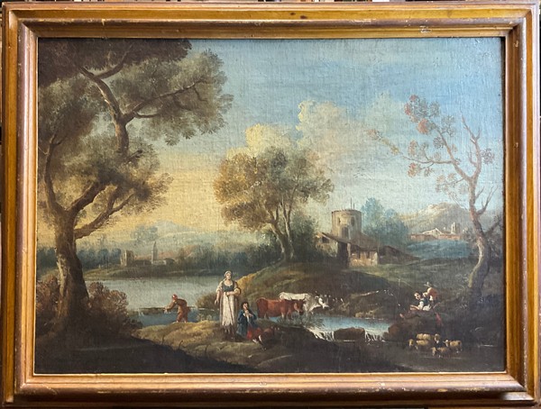 Lotto 1984 | Scuola veneta del secolo XVIII "Paesaggio con lavandaie" olio su tela (cm 65x8