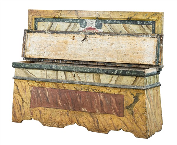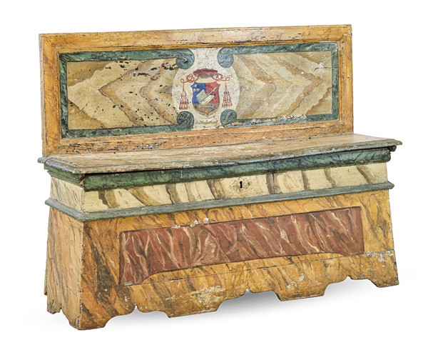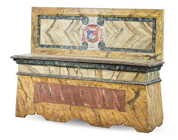 Coppia di panche in legno dipinto in policromia a finto marmo, fascia inferiore sagomata, sedili sollevabili con vano contenitore e serratura, schienale con cornice centrato da stemma cardinalizio. Italia centrale, secolo XVIII (cm 132x99x36) (difetti, restauri e mancanze)