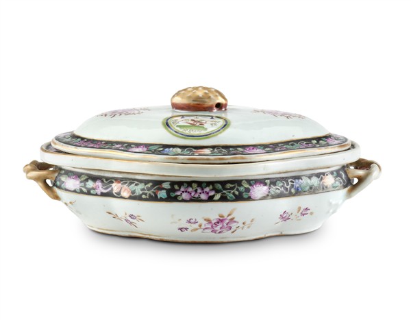 Manifattura della Compagnia delle Indie, Cina, secolo XVIII. Portavivande biansato in porcellana policroma con decori floreali, nastri e volatili entro cartigli (cm 24x16) (difetti e rotture)