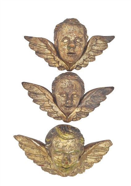 Gruppo di tre teste d'angelo in legno intagliato e dorato a mecca. Secolo XIX (cm max 41x20) (difetti)