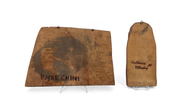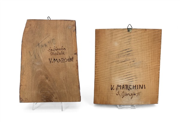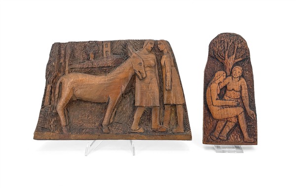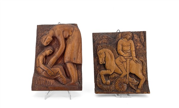 VITILIANO MARCHINI Gruppo di quattro formelle in legno intagliato con scene di g