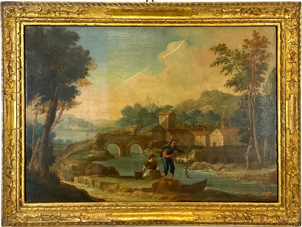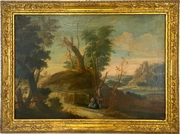 Scuola del secolo XVIII "Scena galante in un paesaggio" e "Pescatore e lavanda