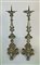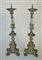 Coppia di candelieri in legno rivestito in metallo argentato decorato a volute e cartigli, con base tripode. Secolo XVIII (h cm 77) (difetti)