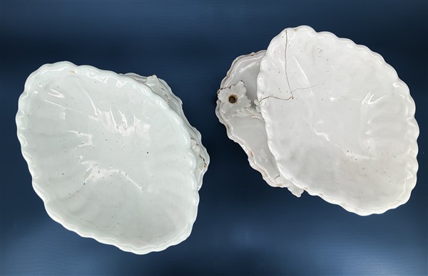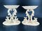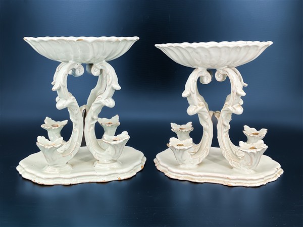 Manifattura del secolo XVIII. Coppia di alzate a coppa bacellata in maiolica bianca con sostegni a volute contrapposte e quattro portacandela su base sagomata (cm 22,x21,5x16) (difetti e restauri)