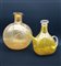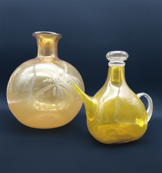 Manifatture diverse, secolo XIX-XX. Lotto composto da una bottiglia e un contenitore con tappo in vetro policromo a fiori, una bottiglietta, un vaso globulare con decori incisi e un versatoio ad un'ansa con tappo in vetro soffiato (h mx cm 34) (difetti)