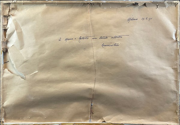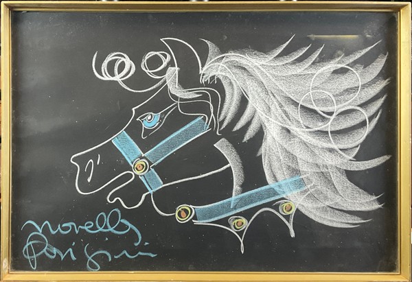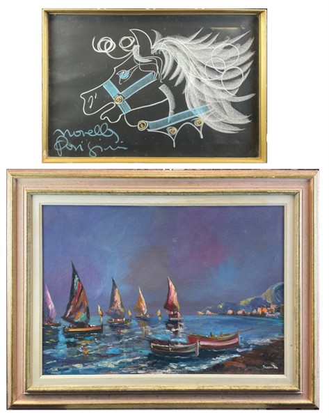 Lotto composto da un dipinto ad olio su tela raffigurante marina con barche firmato Franco Tizi e datato al verso 1974 (cm 50x70), e un disegno a gessetti colorati raffigurante testa equina firmato Novella Parigini (cm 70x48), in cornici (lievi difetti)