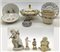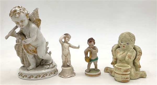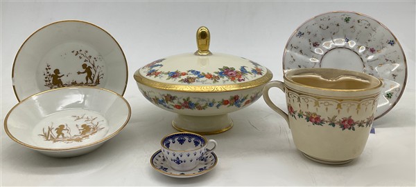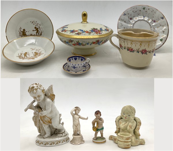 Manifatture diverse. Lotto composto da tre diversi piattini in porcellana con profili dorati, tazza con parabaffi, tazzina con piattino da bambola, zuppierina con coperchio a motivi floreali, due figurine di putti, angioletto e un portacandele (h max cm 15) (difetti)