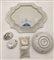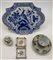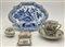 Manifatture di Herend. Lotto composto da una tazza trembleuse con piattino e una scatolina a uovo in porcellana. Unite a un vassoio mistilineo con decoro in blu, Delft e due posaceneri di diversa manifattura (cm max 23,5x30,5) (difetti)