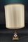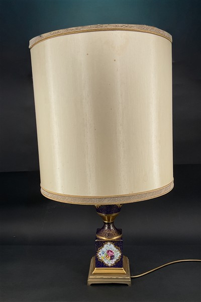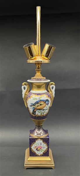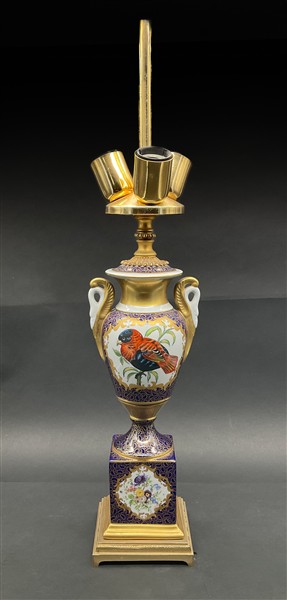 Manifattura francese. Lampada d'appoggio a tre luci in porcellana a forma di vaso dipinto in policromia ad elementi naturalistici ed anse a forma di cigno (h tot con paralume cm 85) (lievi difetti)
