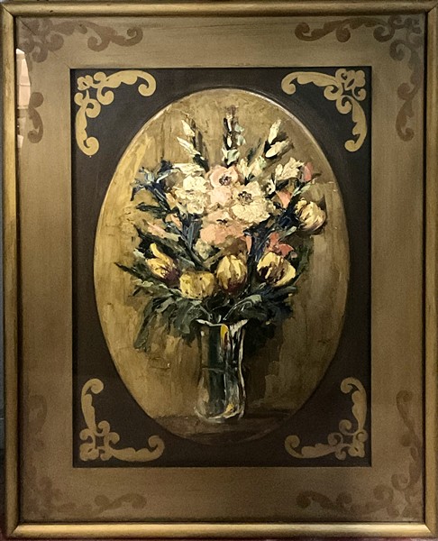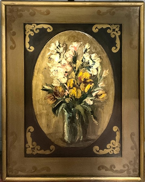 Coppia di dipinti ad olio su tavola ovale raffiguranti fiori (cm 68x48)con passe-partout sagomato e dipinto (misura tot. cm 103x83). Firmati, iscritti e datati 1994 al retro (difetti)