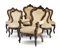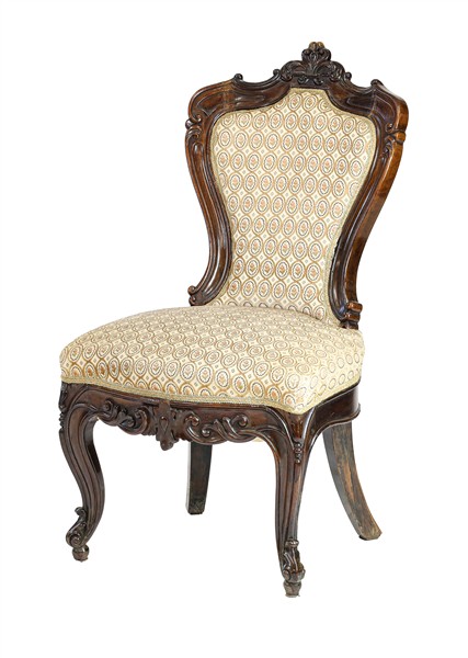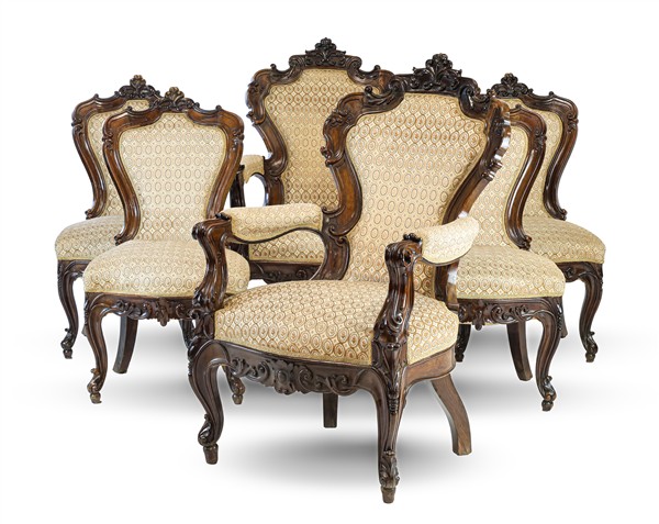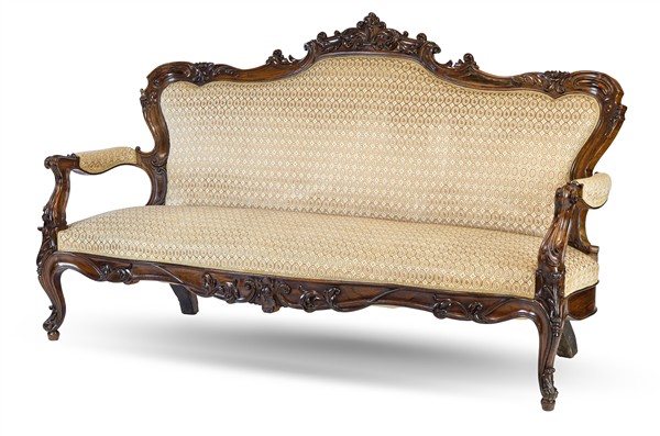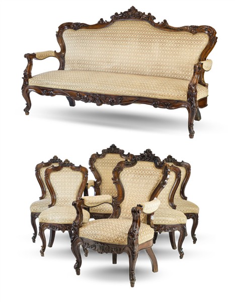 Fornitura da salotto in legno intagliato composta da divano a tre posti, coppia di poltrone e quattro sedie con decori a volute contrapposte e gambe mosse. Secolo XIX (l max cm 212) (difetti)