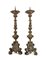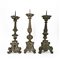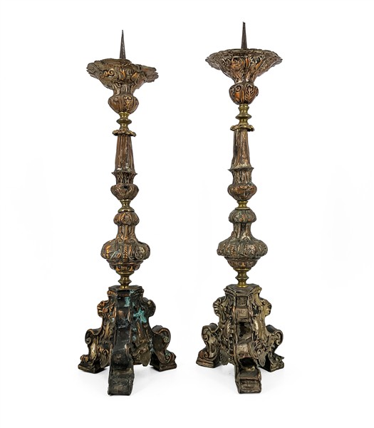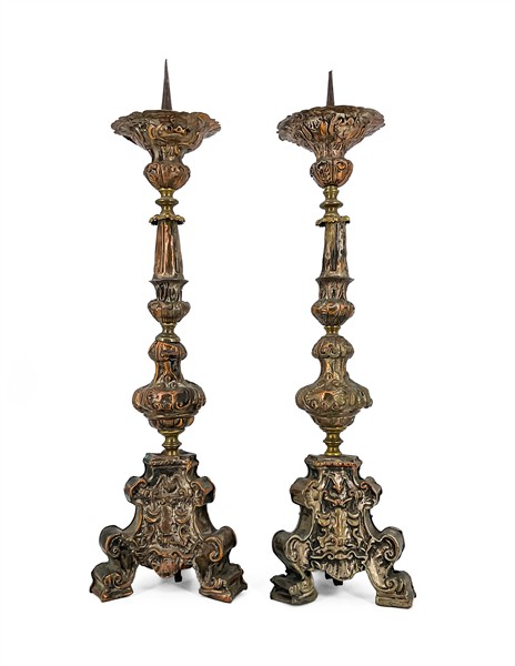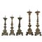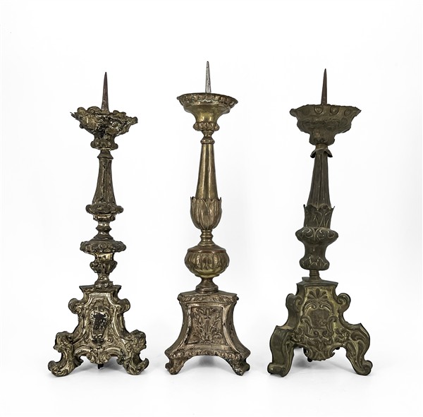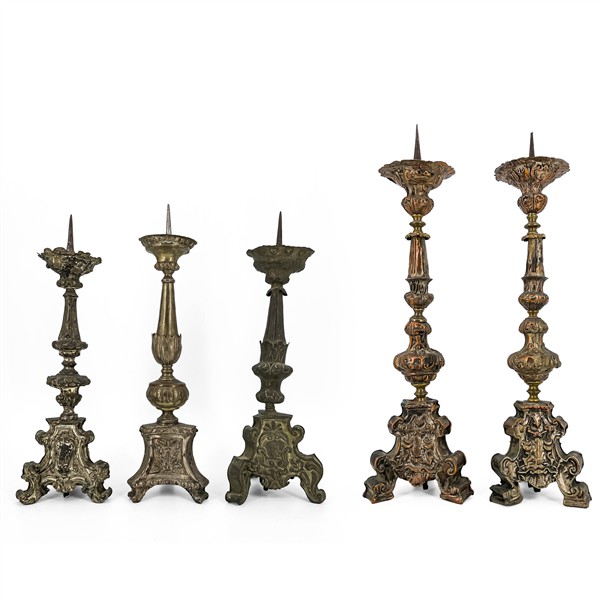 Lotto di cinque diversi candelieri in legno rivestito in metallo argentato inciso e sbalzato di simil decoro a volute fogliate e cartigli, su basi tripodi. Secolo XVIII (h max cm 52) (difetti)