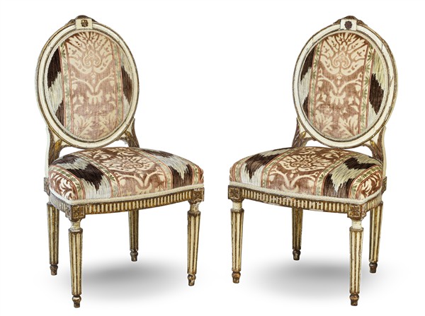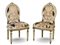 Coppia di sedie in legno intagliato, laccato e dorato con schienale a medaglion