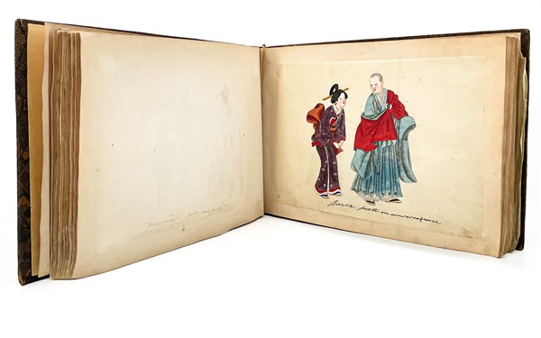 Album con acquerelli su carta di riso raffiguranti mestieri. Giappone, secolo XIX. Recante iscrizioni in italiano manoscritto alla fine del secolo XIX (difetti)