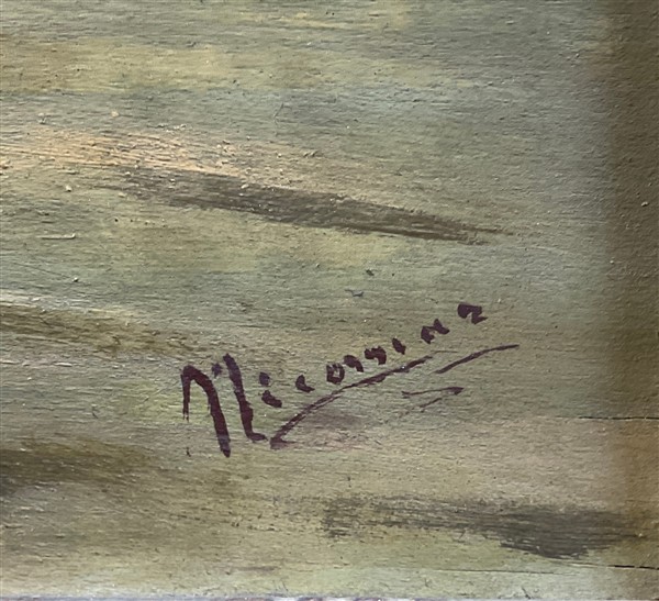 Firma indecifrata "Marina con pescatori" olio su compensato (cm 40x27) firmat