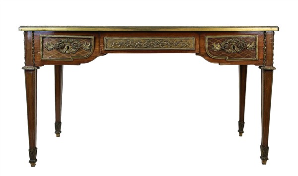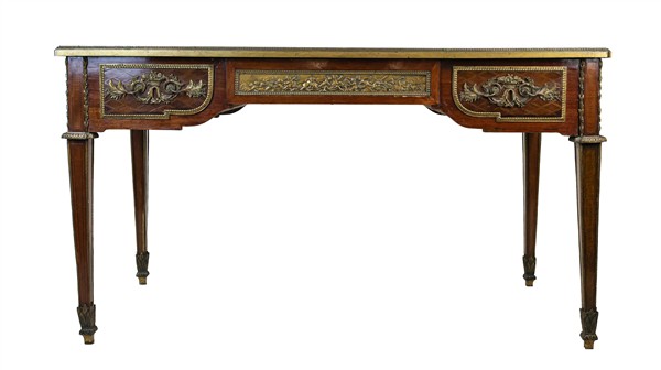 Scrittoio da centro impiallacciato a marqueterie in legni di varie essenze con tre cassetti sul fronte di cui uno centrale con apertura a pulsante segreto. Fasce decorate da cartelle a rilievo con giochi di putti in bronzo, piano con ciglio e fregi in bronzo decorati a foglie e cordonati (cm 130x73x73) (difetti)
