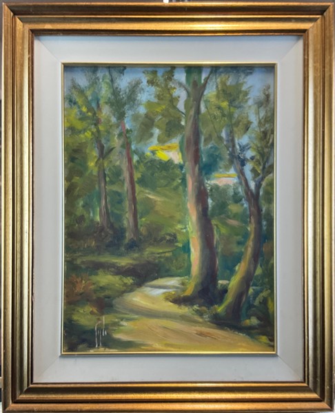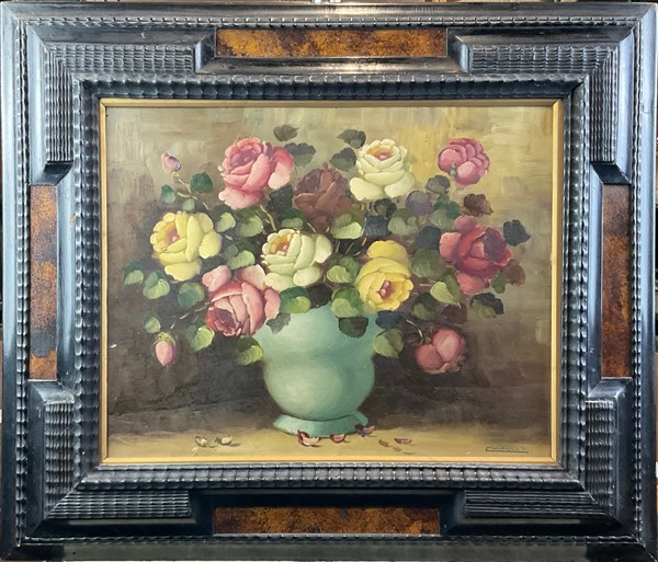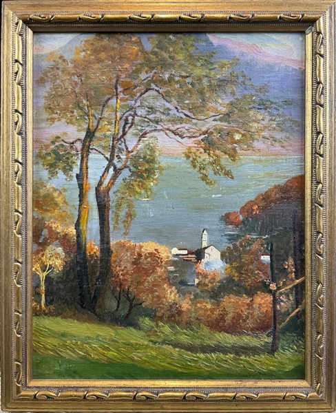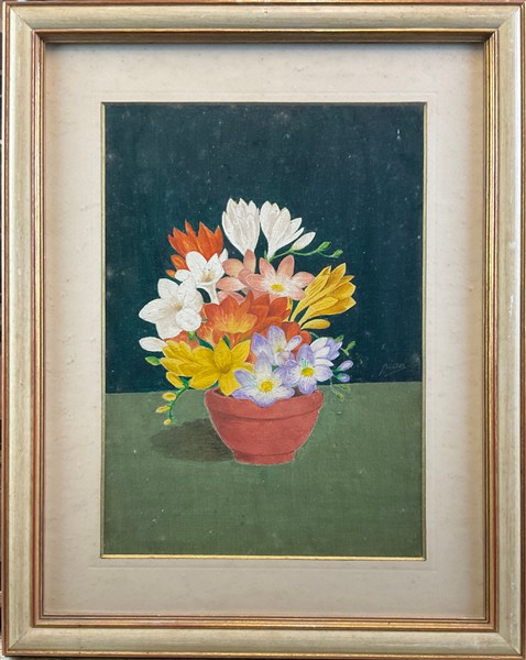 Lotto composto da sei dipinti ad olio su supporti differenti di cui tre raffiguranti vasi con fiori, uno scorcio urbano e due paesaggi con alberi, autori e misure differenti (cm max 40x50), in cornici (difetti)