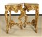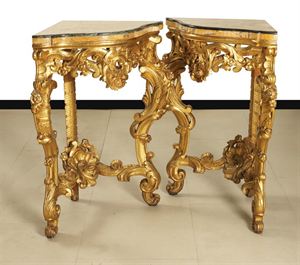 COPPIA DI ANGOLIERE Coppia di angoliere in legno scolpito e dorato con piano in marmo, metà XVIII secolo H 92 67x48 cm