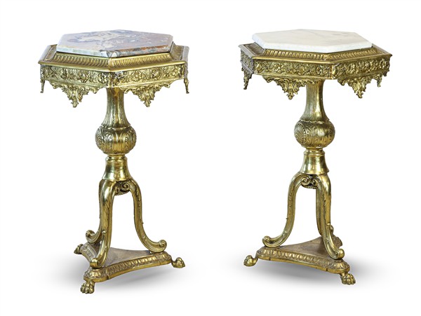 Coppia di tavolini in ottone di forma esagonale con sostegni tripodi e piedi ferini, piani in marmi diversi (cm 45x76x45) (difetti)