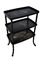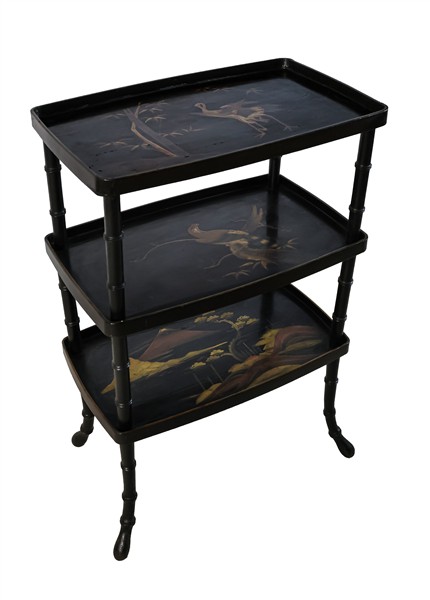 Etagère in legno ebanizzato a tre ripiani decorati a volatili e paesaggi in sti