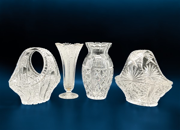 Lotto composto da due cestini e due diversi vasi in vetro molato (h max cm 26)