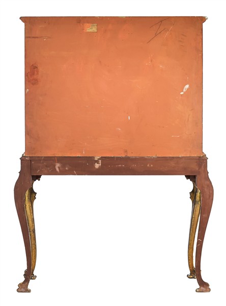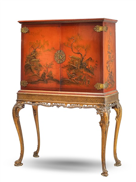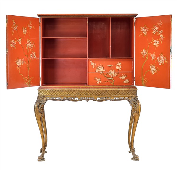 Cabinet in legno laccato di gusto orientale a pagode e fiori su fondo rosso, gambe mosse in parte traforate e dorate, doppio sportello celante vani e tiretti. Secolo XX (cm 117x162x42) (difetti e rotture)