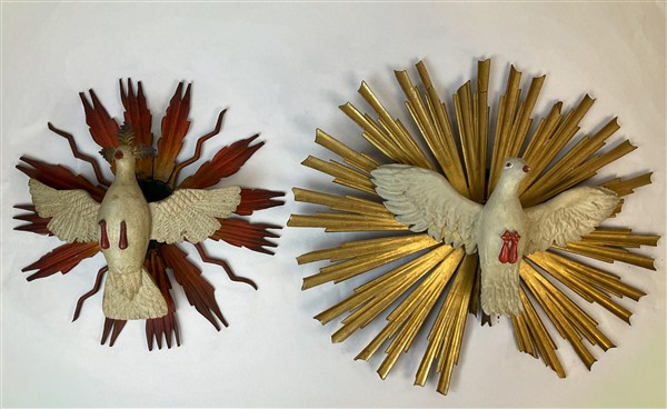 Lotto composto da un fregio in legno intagliato, dipinto e dorato raffigurante Spirito santo sotto forma di colomba ed uno similare. Secolo XIX (h max cm 65) (difetti e restauri)